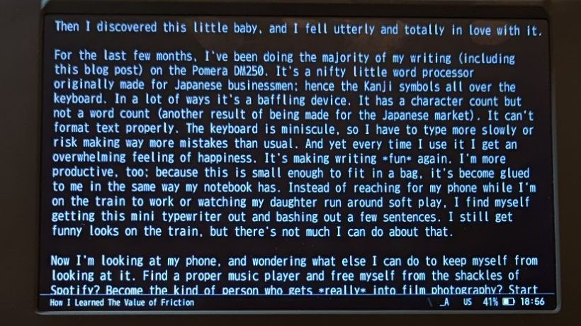 For the last few months, I’ve been doing the majority of my writing (including this blog post) on the Pomera DM250. It’s a nifty little word processor originally made for Japanese businessmen; hence the Kanji symbols all over the keyboard. In a lot of ways it’s a baffling device. It has a character count but not a word count (another result of being made for the Japanese market). It can’t format text properly. The keyboard is miniscule, so I have to type more slowly or risk making way more mistakes than usual.
